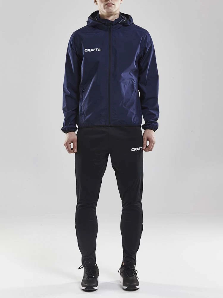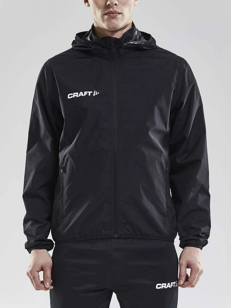 Lightweight rain jacket with taped seams for training in wet conditions. Mesh lining provides efficient moisture transport and soft touch against skin. Removable hood.