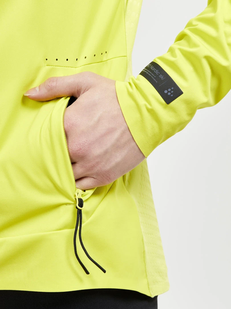 The jacket has a 3-layer wind and waterproof stretch material on the front and on the sleeves and recycled, functional tricot in the back for efficient ventilation and moisture transport. Perforated ventilation in the sides and armpits ensures that you stay cool and focused even during really hard workouts or competitions.