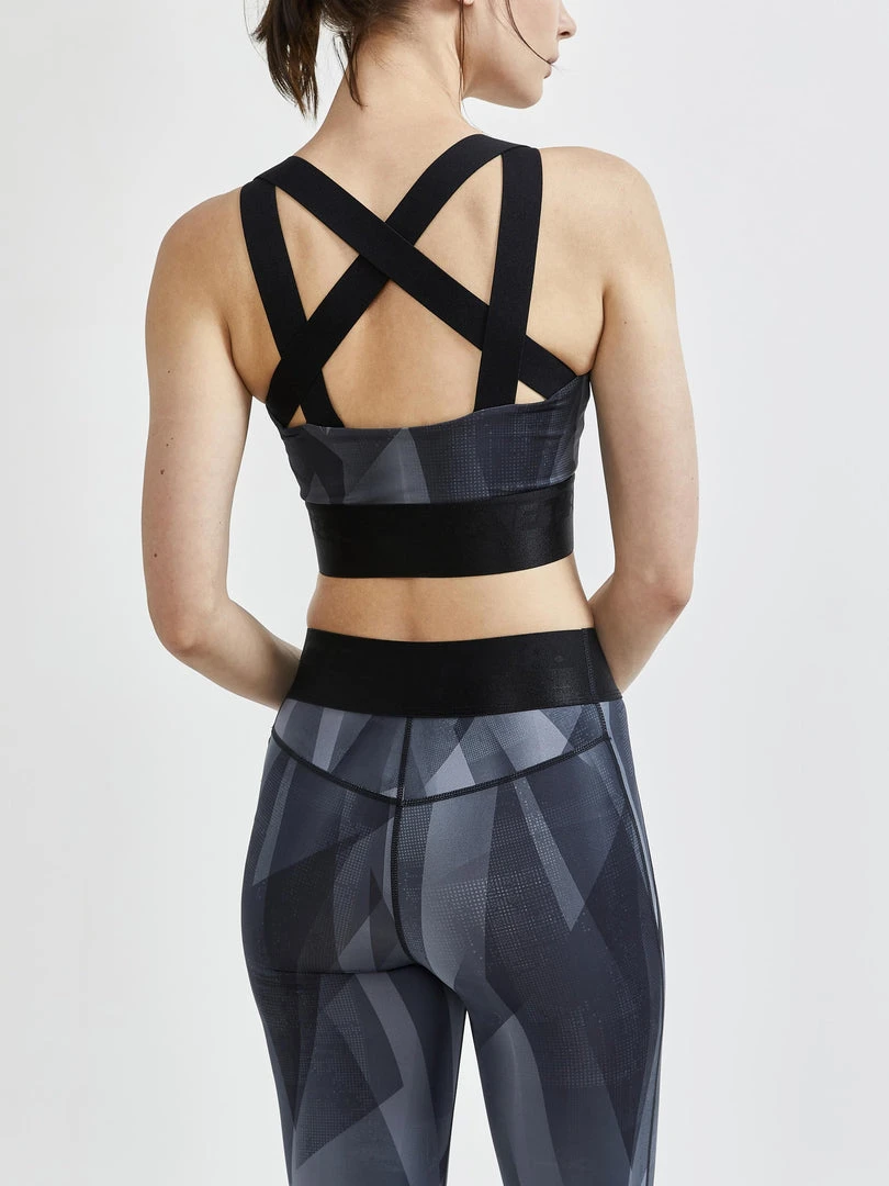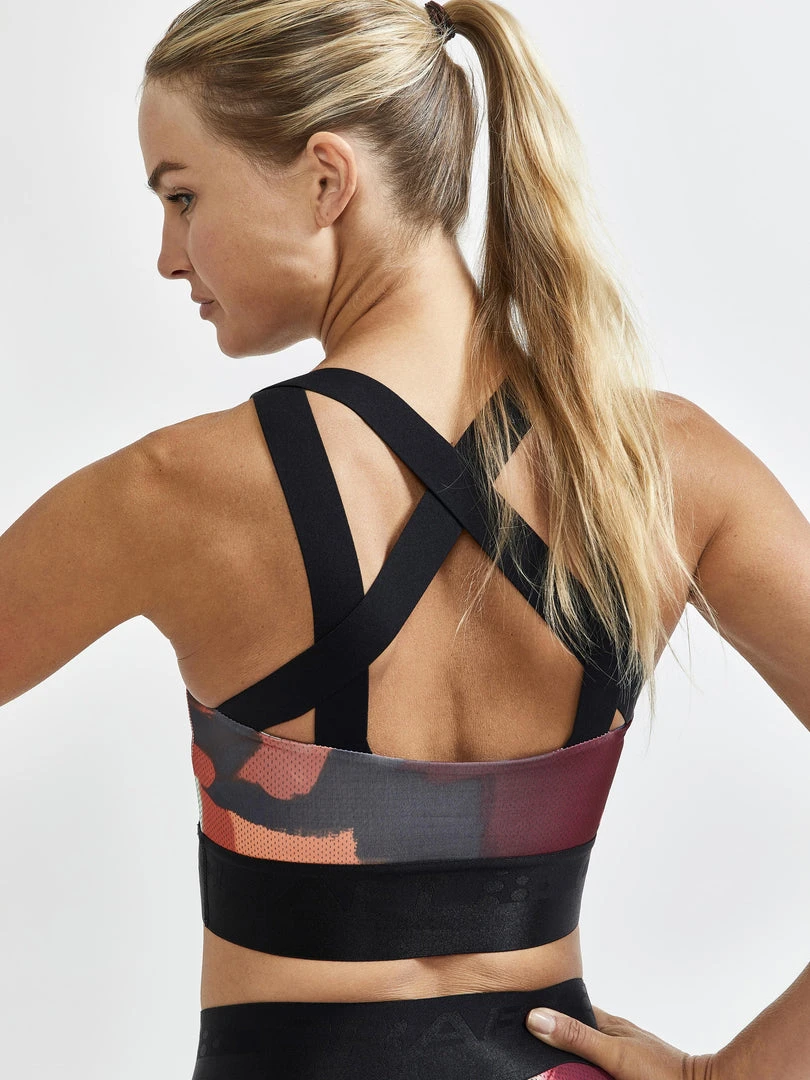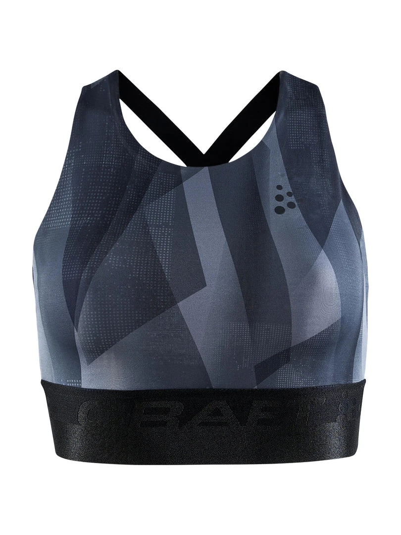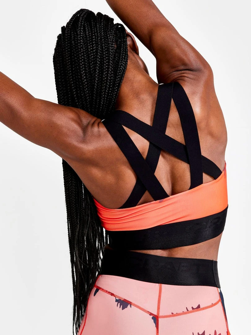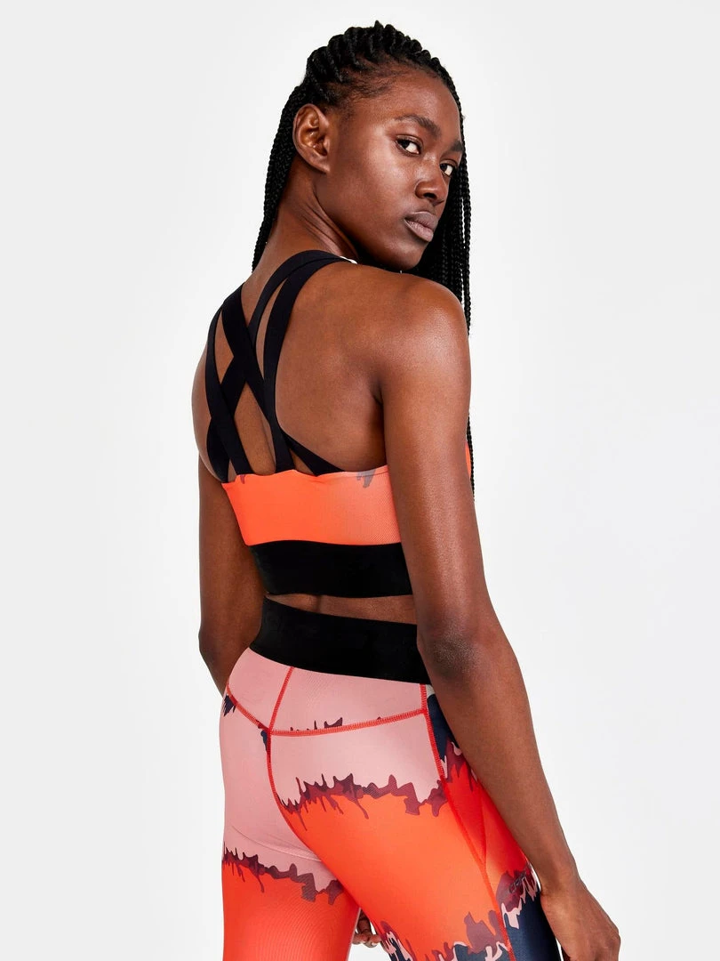 Dynamic sports bra with light support. Lined for coverage, with elastic at bottom, and substantial straps crossed at the back, the Core Charge Sport Top stands out for its design and utility. Made of soft and functional recycled polyester and elastane jersey comfort is at the forefront in this multiuse bra.