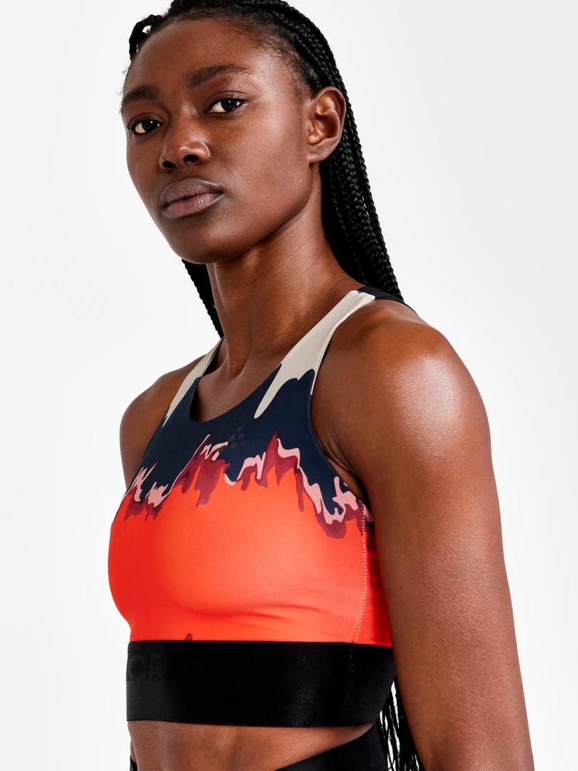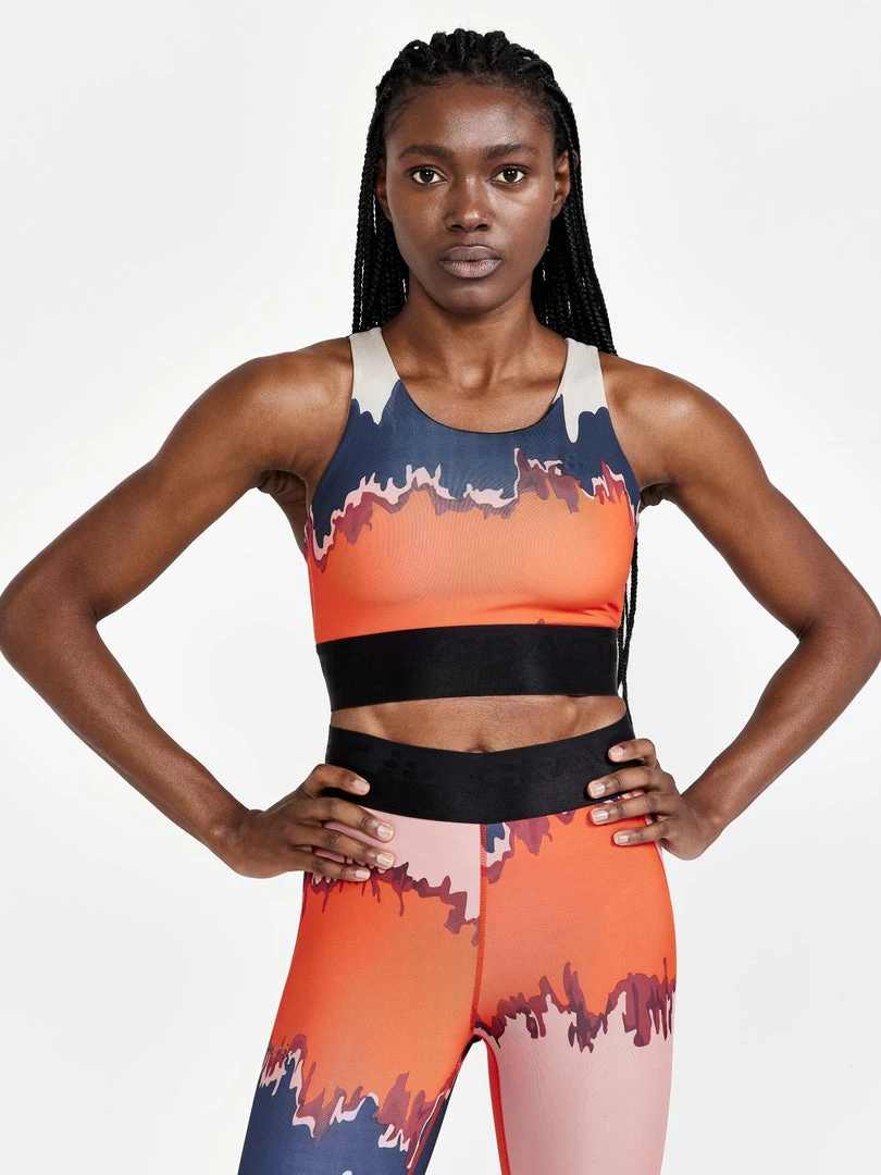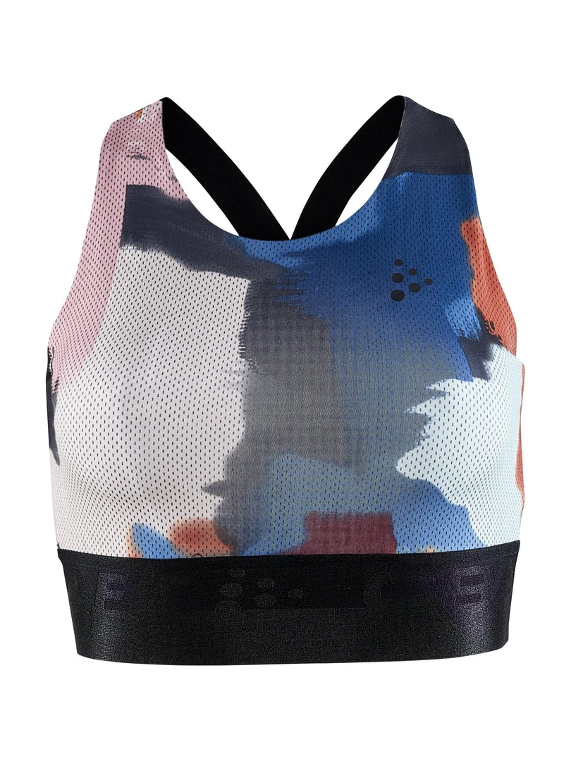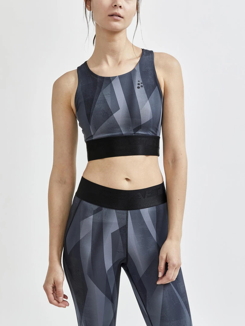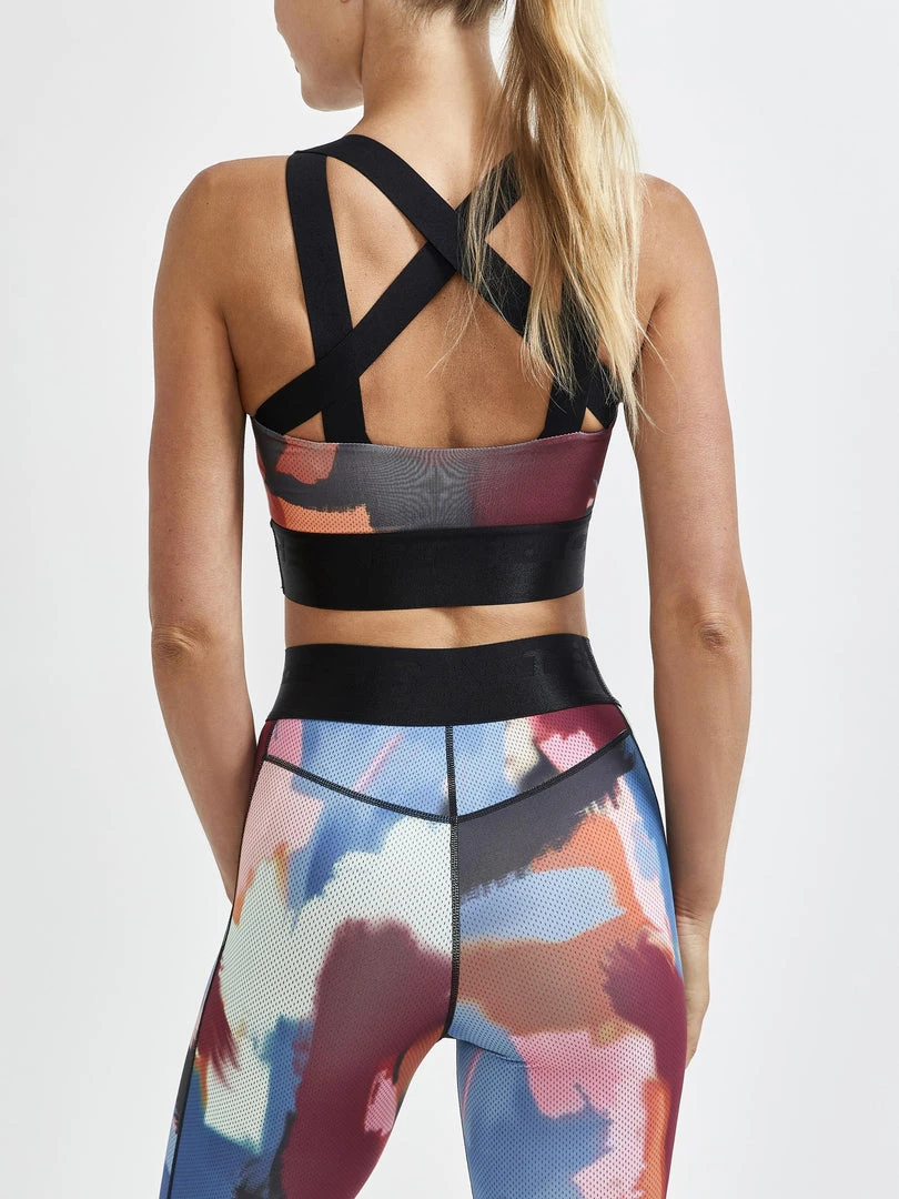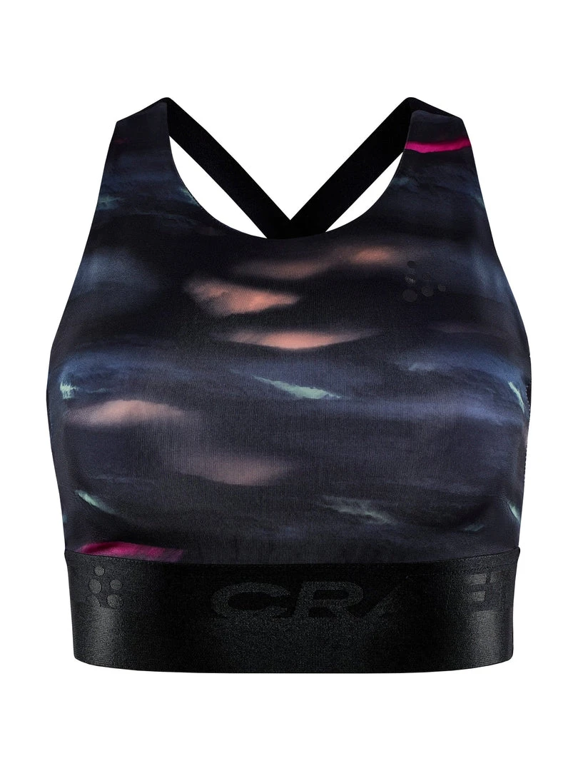 Dynamic sports bra with light support. Lined for coverage, with elastic at bottom, and substantial straps crossed at the back, the Core Charge Sport Top stands out for its design and utility. Made of soft and functional recycled polyester and elastane jersey comfort is at the forefront in this multiuse bra.